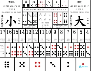 - 大小:玩家可以下注骰子总和的大小。总和为4-10点为小,11-17点为大。围骰(即三颗骰子点数相同)除外。