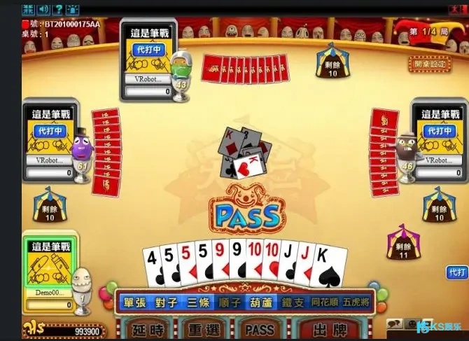 在KS娱乐大老二游戏中,你的目标是尽可能快速地打出手中的所有牌。玩家需要出比上家更大的牌,若其他玩家都选择“过”,则你将获得本轮胜利,并继续出牌。最先打完所有手牌的玩家将成为本局的赢家。