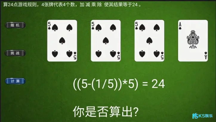 无论你是初学者还是高手,都能在KS娱乐24点游戏中找到属于你的乐趣和挑战。还等什么?快来挑战吧,看看你能在多短时间内算出24点