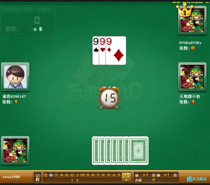 在KS娱乐双扣游戏中,名次的决定完全取决于出牌的顺序: